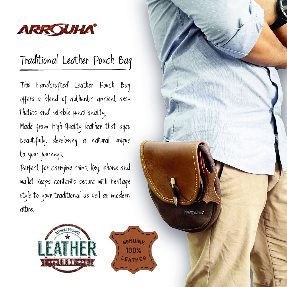 Available in combination of natural leather color this pouch makes it easy to coordinate with different garments and belts. The reinforced belt loops accommodate straps up to 4 inches wide, providing compatibility with both period and contemporary belts or Malay. Bengkung.